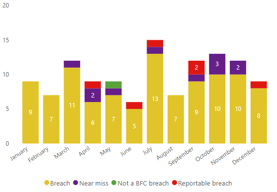 | Month | Breach | Near miss | Not a BFC breach | Reportable breach |